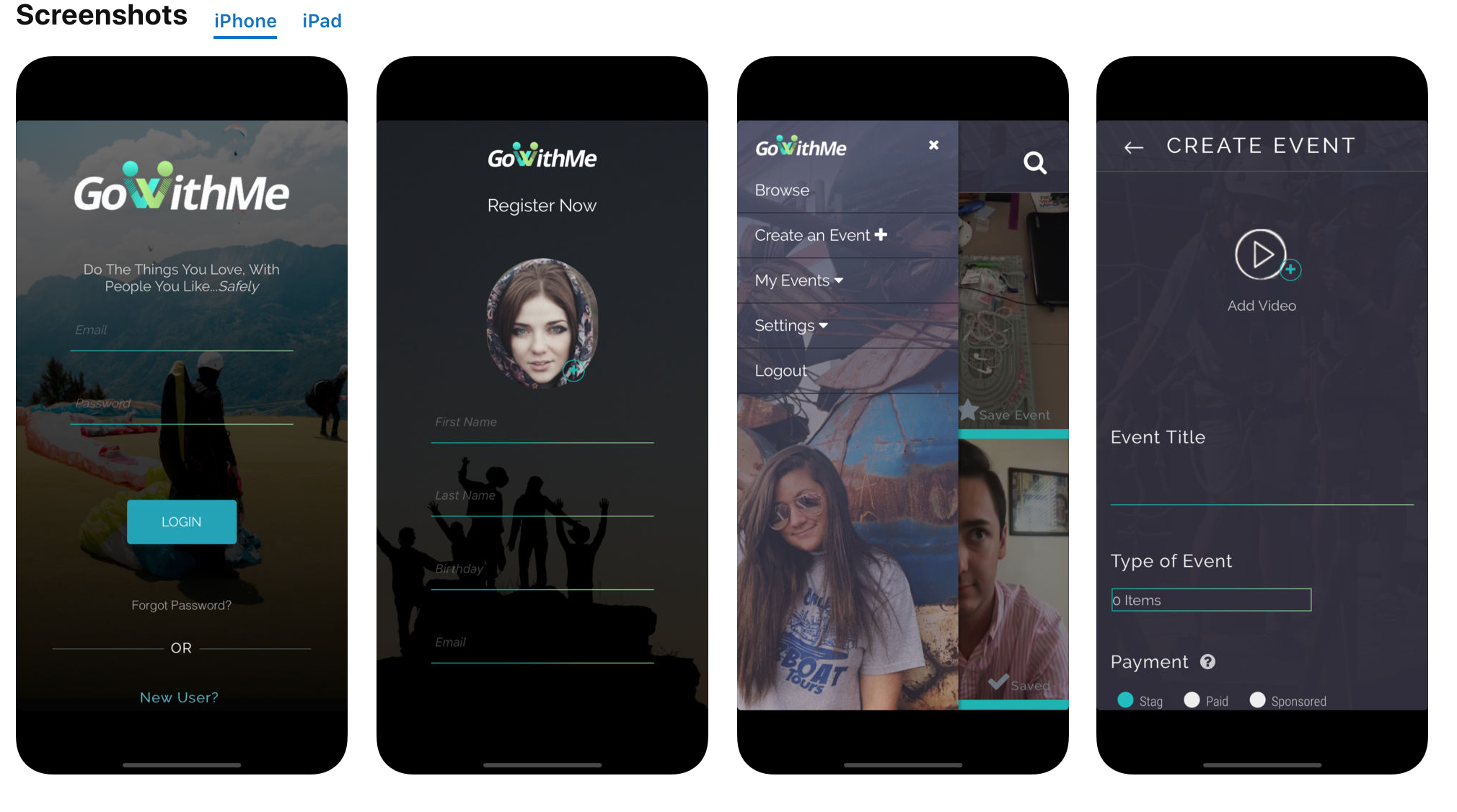 GoWithMe is a iOS and Android app that allows users to go to events together. GoWithMe also has a number of proprietary safety and security features that were custom built to help safely track users and protect users identity/security.